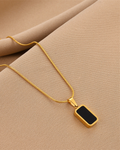 - Die Noir Halskette: Ein minimalistischer schwarzer Anhänger in einer goldfarbenen Fassung, entworfen, um jedem Outfit einen Hauch von Eleganz und Kühnheit zu verleihen.