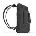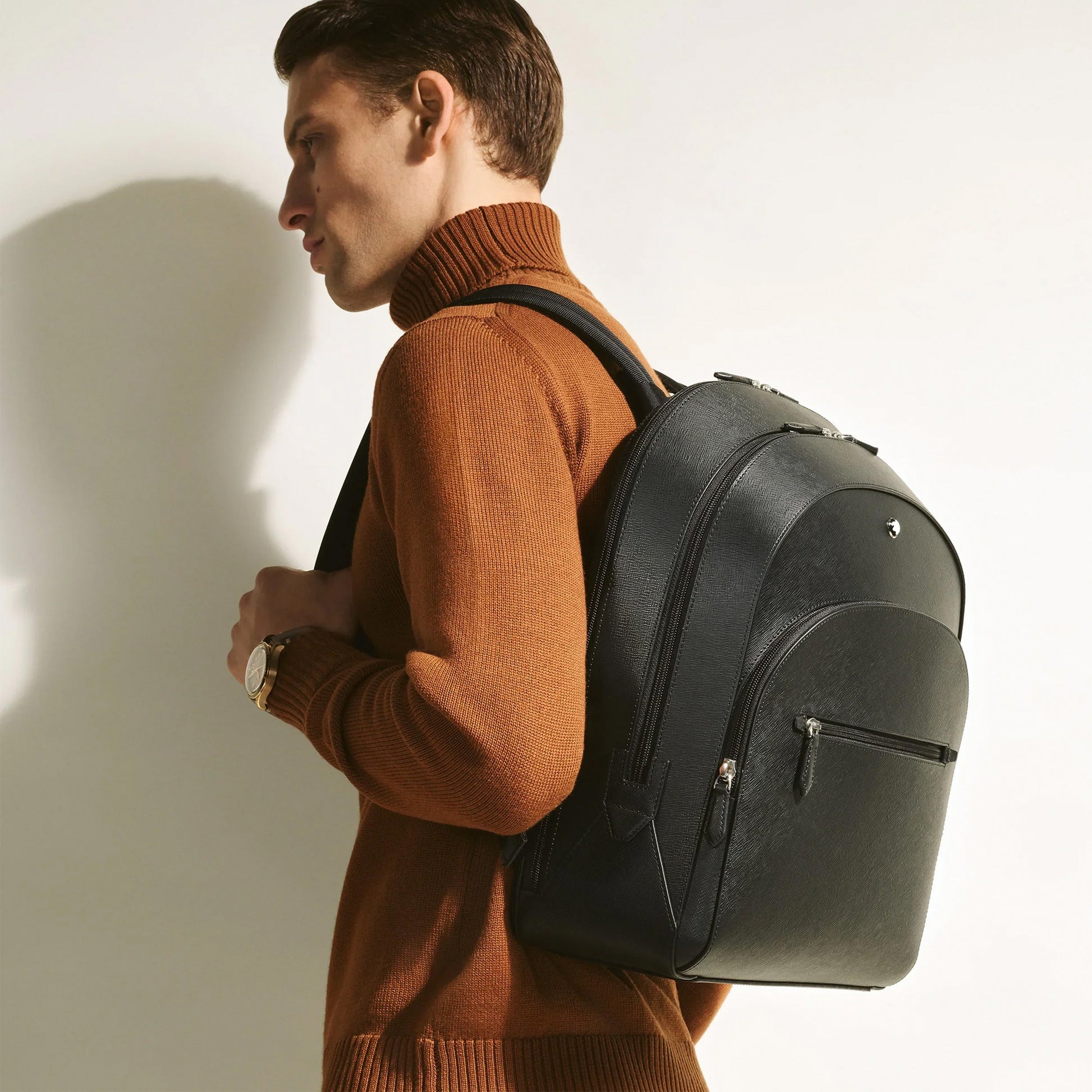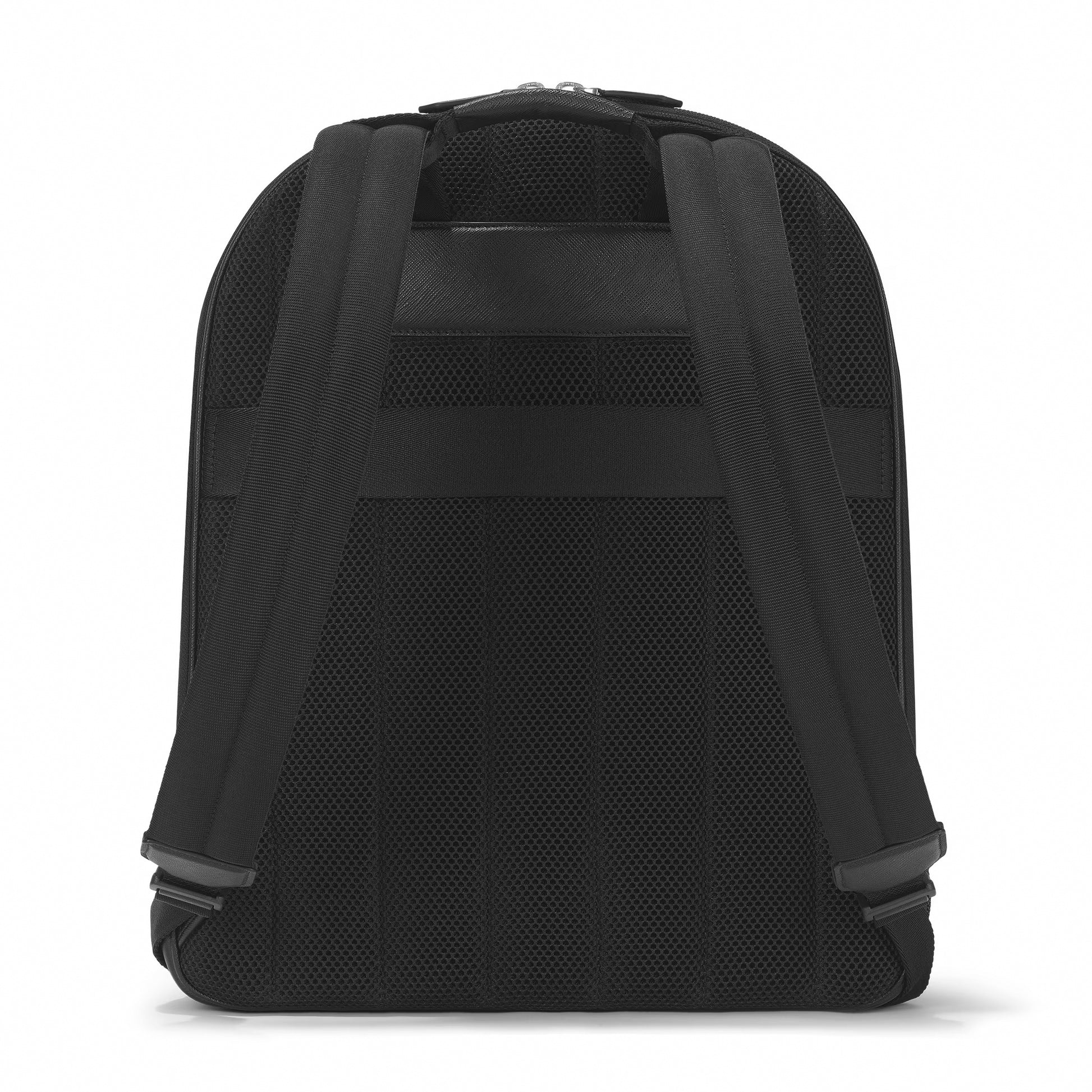 This large backpack for mobile professionals and urban commuters offers ample space for everything you need for a workday or business trip. Documents in A4 format, electronic devices, and business materials can be neatly and comfortably stored in the three main compartments. The saffiano-embossed leather highlights its cosmopolitan character.